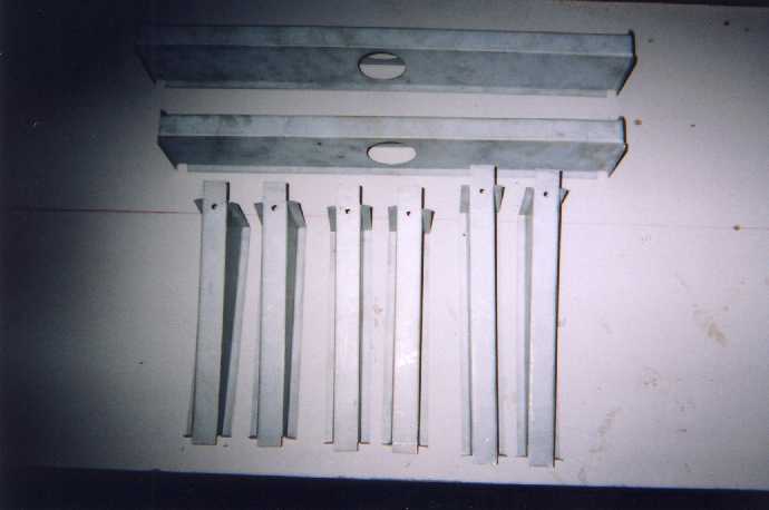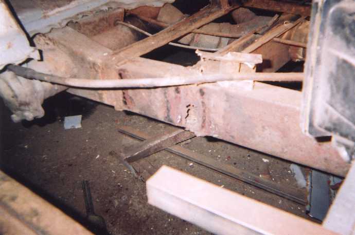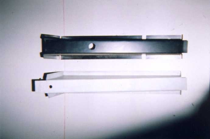| The black parts here are Brazilian VW parts, whereas the galvanised parts are parts I had copied from NOS German parts. There are some notable differences between the two. The Brazilian parts have many more holes than original German parts. I had started to weld up all of these holes but soon realised it was going to take forever. Instead I had these galvanised copies made from genuine German NOS parts. The differences between Brazilian and German parts extends to the outriggers. The original German outriggers have a small water drain hole and a tongue which goes under the main chassis rail, whilst the Brazilian parts finish short of the chassis rail and let water drain out in that way. To be honest the Brazilian outrigger is better designed with respect to water removal but, being a slave to originality, I was duty bound to copy exactly the German part. |